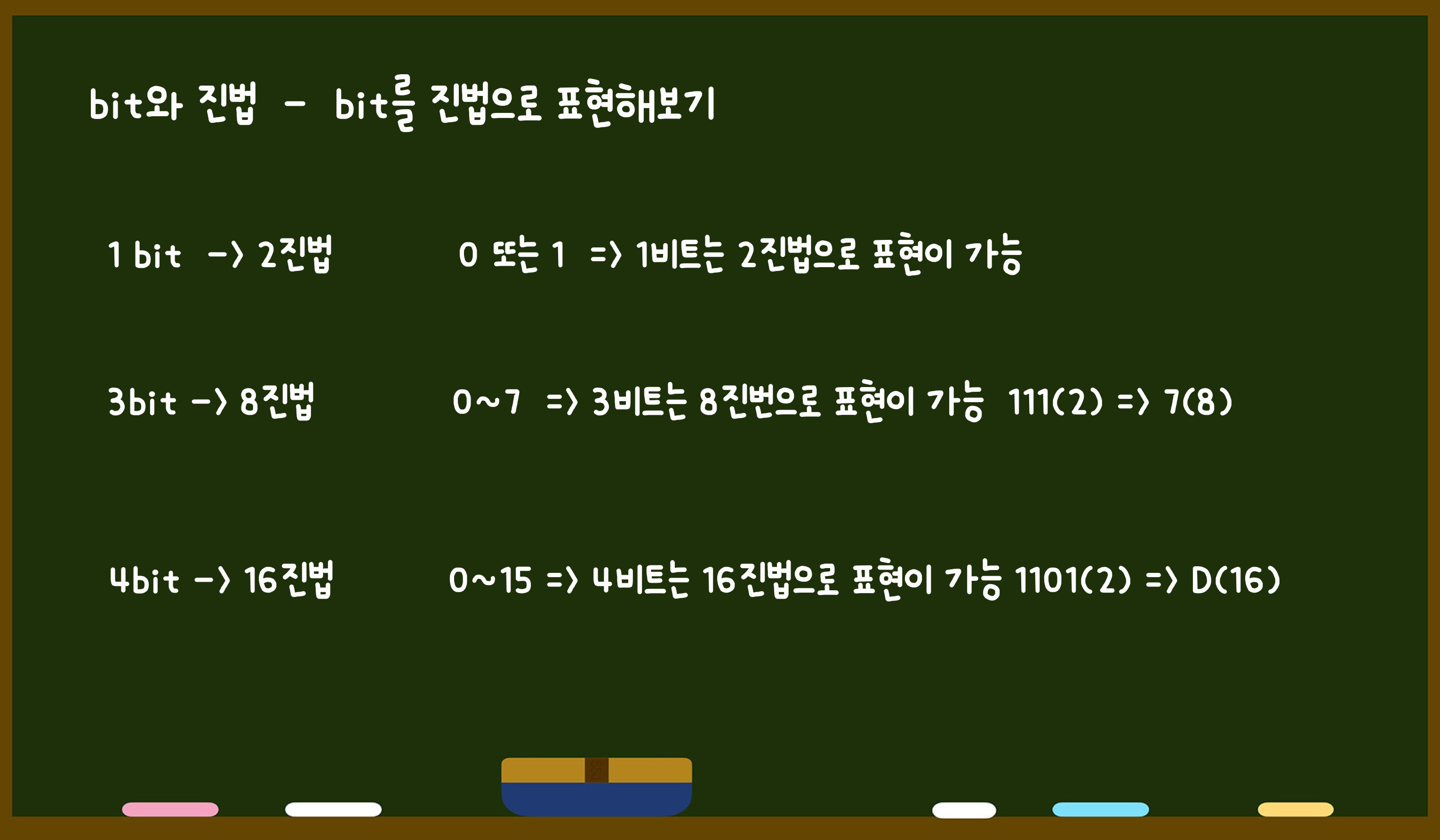 1비트, 3비트, 4비트는 각각 2진법, 8진법, 16진법으로 표현이 가능하다.