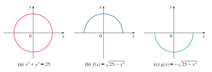 $$ \begin{align} & x^2 + y^2 = 25 \\ & y = \pm \sqrt{25 - x^2} \end{align} $$